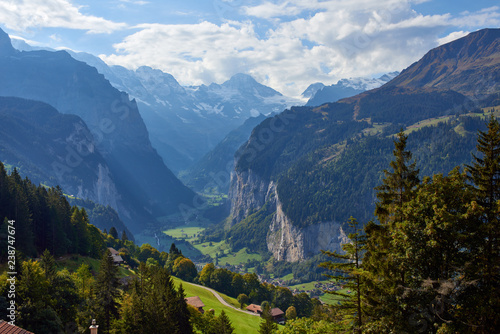 Fototapeta premium Mountain dramatic valley view from Wengen village in Lauterbrunnen in...