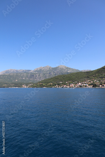 Fototapeta premium mountain fishing village in the fjords of Montenegro. Bay of Kotor. Vertical photo