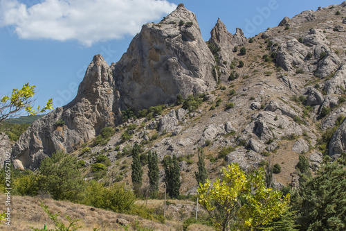 © Yuri Bizgaimer, Obraz premium Mountain forest landscape under evening sky