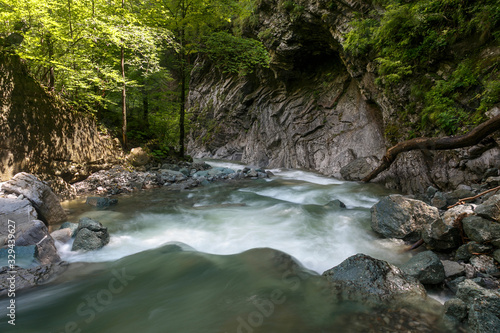 © alpinetrail, Fototapeta premium Mountain forest stream with fast flowing water and rocks, long exposure.