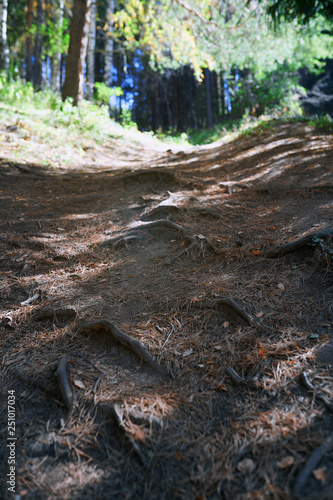© Arman Zhenikeyev, Naklejka premium Mountain forest with pine trees