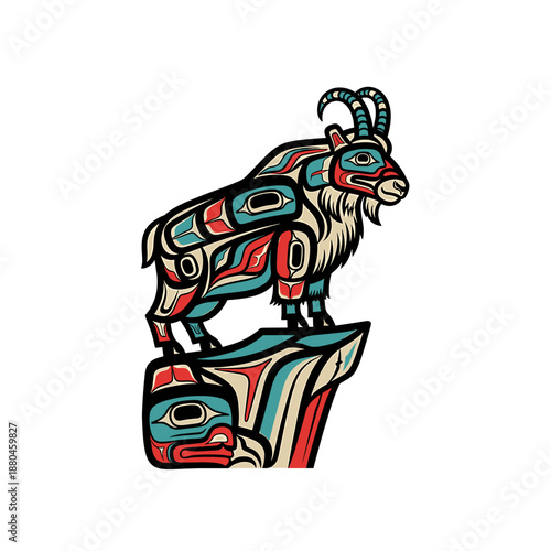 Fototapeta premium Mountain goat illustration in a Northwest Coast art style, standing atop a...