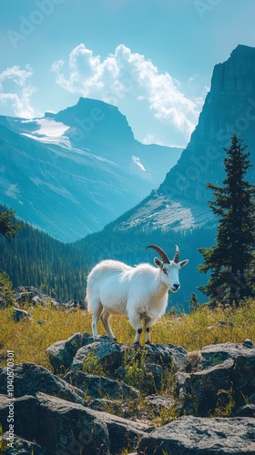 © Grace, Fototapeta premium Mountain Goat Roaming Through Rocky Terrain at Glacier National Park Along Going-to-the-Sun Road. Generative AI