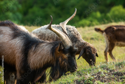 Fototapeta premium Mountain goats grazing in the Carpathian Mountains of Romania. The happy goat...