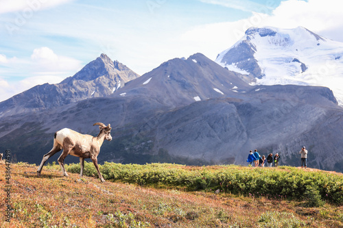 © Jing, Fototapeta premium Mountain Goats looking at tourist in Canadian Rockies. Photo taken in Icefields Parkway