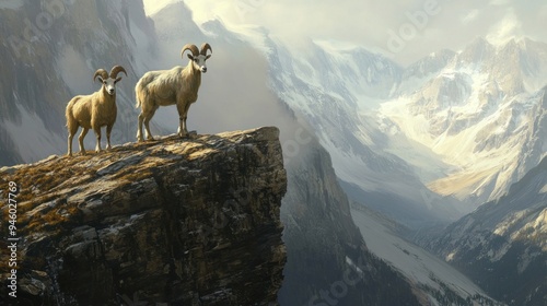 © almeera, Fototapeta premium Mountain Goats on a Cliffside in a Snowy Mountain Range
