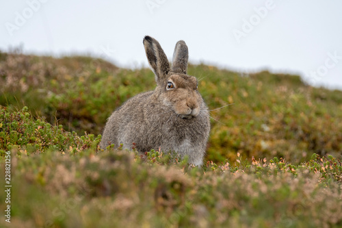 © Karen Miller, Fototapeta premium Mountain Hare in Summer Pelage Sitting in Form on Moorland in October (Lepus timidus)