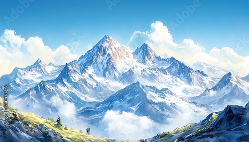 Fototapeta premium Mountain hiking, clear sky, majestic peaks, watercolor style