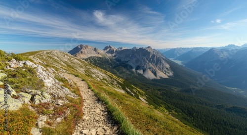 © Artyom, Fototapeta premium Mountain hiking trail with panoramic view of rugged peaks under clear sky