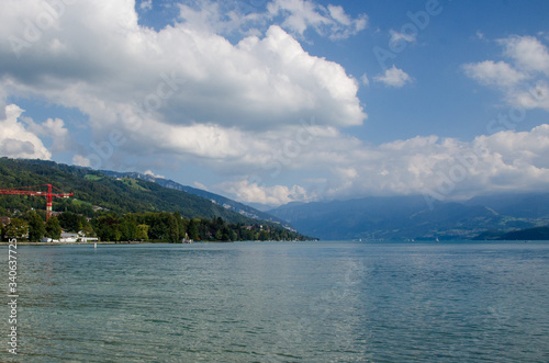 © alexphoto1993, Fototapeta premium Mountain lake against the backdrop of the Alpine mountains