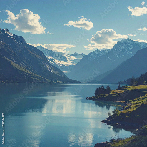 © SuFiSa, Naklejka premium Mountain lake and blue sky. Background Image. Minimalist backdrop. Template design