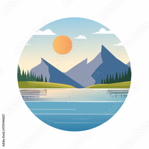 Naklejka premium Mountain lake at dawn, morning light and sun, minimalist landscape, vector illustration
