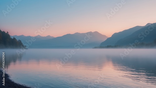 Obraz premium Mountain Lake at Sunrise with Fog and Reflections