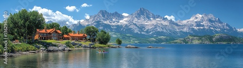 © Aksara, Fototapeta premium Mountain Lake Cabin Kayak Scene.