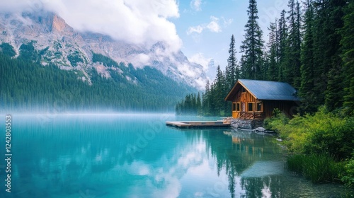 Fototapeta premium Mountain Lake Cabin Peaceful Serene Nature Escape