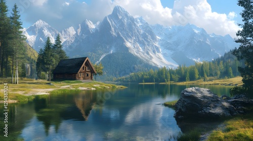 Fototapeta premium Mountain Lake Cabin Serenity Peaceful Alpine Retreat