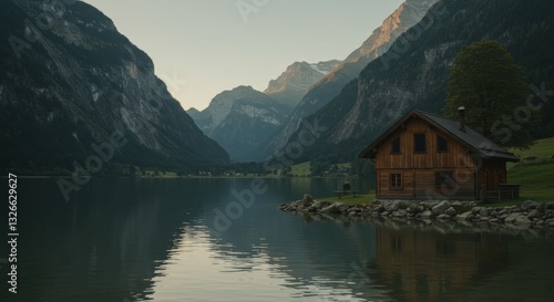 © Nima, Fototapeta premium Mountain Lake Cabin Serenity - Tranquil lakeside cabin nestled amidst majestic mountains, symbolizing peace, solitude, nature's beauty, escape, and rejuvenation