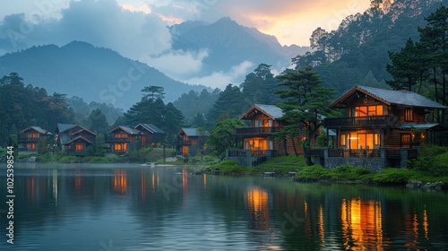 © tyjany, Naklejka premium Mountain Lake Cabins at Sunset