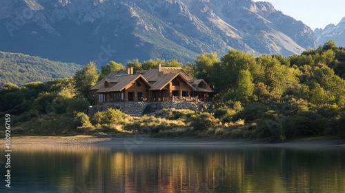 © isrofiyah, Fototapeta premium Mountain Lake House: Serenity by the Water