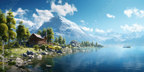 © Malika, Fototapeta premium Mountain lake island featuring a single home