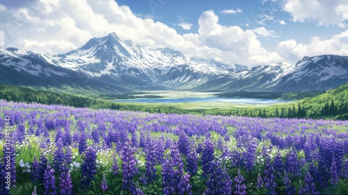 Fototapeta premium Mountain lake lupine field summer scenic travel poster
