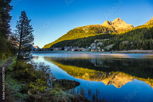Obraz premium Mountain lake panorama with mountains reflection. Idyllic look. Autumn forest. Silvaplana Lake, Switzerland