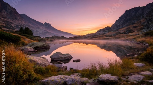 Obraz premium Mountain lake reflecting early morning light with mist covering water surface...