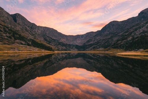 © Lumevia, Fototapeta premium Mountain Lake Reflecting Sunset Sky Colors