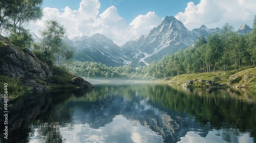 Fototapeta premium Mountain lake reflection, realistic, cinematic light, sharp focus.