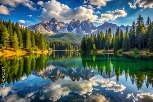 © Srey, Fototapeta premium Mountain Lake Reflection Surrounded by Pine Forest