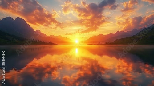 Fototapeta premium Mountain lake sunset reflection, fiery sky, calm water, travel poster