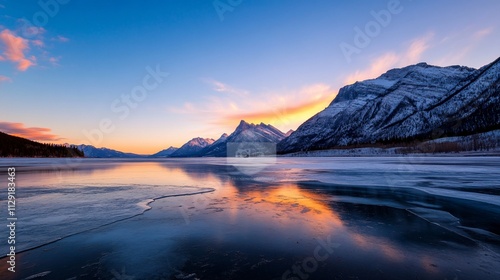 © ngamaz, Fototapeta premium Mountain lake sunset reflection, winter ice.