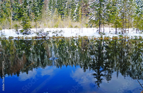 Obraz premium Mountain lake surrounded by coniferous forest covered with white snow on a sunny spring day