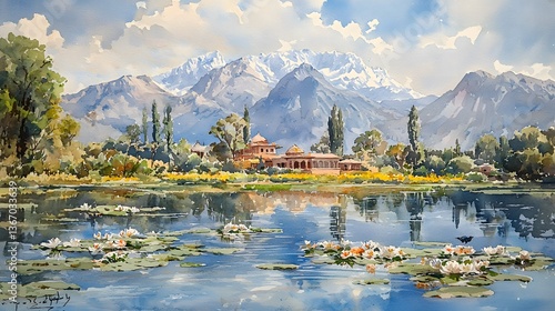 © ezen, Fototapeta premium Mountain lake view with palace and water lilies