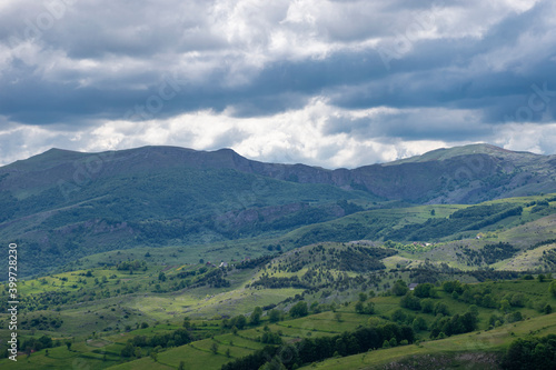 Naklejka premium Mountain landscape against cloudy sky