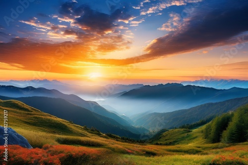 © law, Obraz premium Mountain landscape at sunset, Generative AI