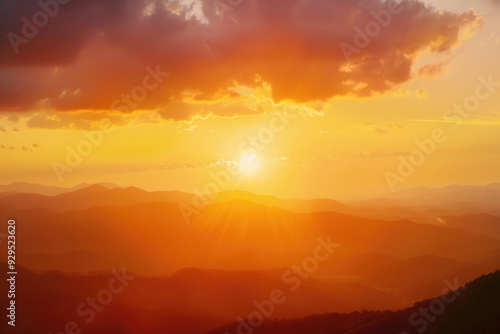 © Ева Поликарпова, Obraz premium Mountain landscape at sunset with warm colors and misty atmosphere