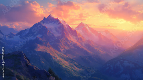 © Dilruba, Obraz premium Mountain landscape bathed in warm hues as the sun sets behind the peaks