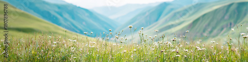 © valeo5, Obraz premium mountain landscape, featuring soft, hazy layers of rolling hills extending into distance under sky. Foreground is dominated by meadow of white and yellow wildflowers, offering sense of depth