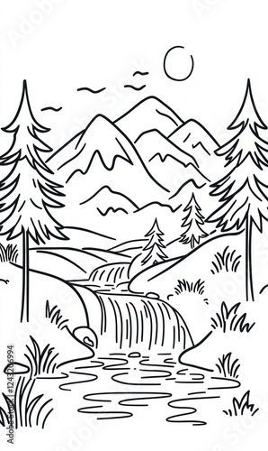 © LyceeChee, Fototapeta premium Mountain Landscape Featuring Waterfall and Pine Trees