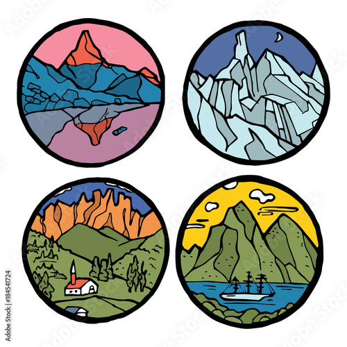© Ethan Aberg, Fototapeta premium Mountain landscape icon set.