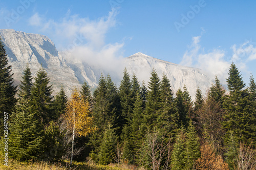 © Darko, Fototapeta premium Mountain landscape in autumn, yellow grass and trees, peak in clouds in distance.
