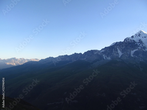 © nika, Fototapeta premium Mountain landscape of Svaneti on bright summer sunny day. Mountain lake, hills covered green grass on snowy rocky mountains background. Caucasus peaks in Georgia. Amazing view on wild georgian nature