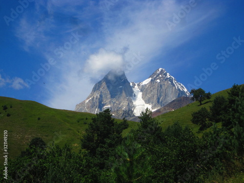 © nika, Naklejka premium Mountain landscape of Svaneti on bright summer sunny day. Mountain lake, hills covered green grass on snowy rocky mountains background. Caucasus peaks in Georgia. Amazing view on wild georgian nature