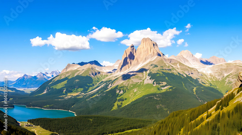© Badhan, Fototapeta premium Mountain landscape of the Swiss Alps with a clear blue sky over a summer valley and a tranquil lake reflecting the high peaks