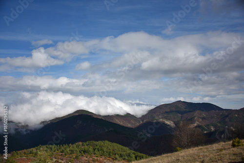 Fototapeta premium Mountain landscape peaks needles trees pines shrubs autumn foliage forest flora nature blue sky white cirrus and cumulus clouds