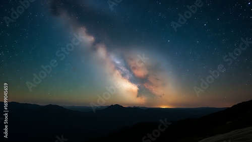 Fototapeta premium Mountain landscape under a starry night sky with the Milky Way visible,...