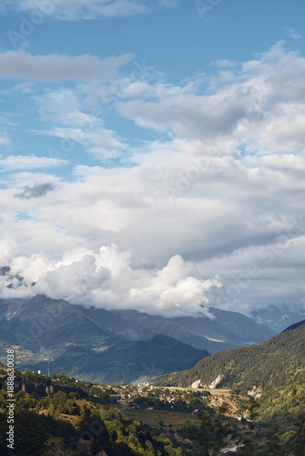 Fototapeta premium Mountain landscape valley and village under dramatic clouds panoramic nature...
