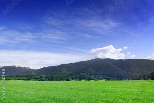 © Trutta, Fototapeta premium Mountain landscape, view of green field under the blue sky