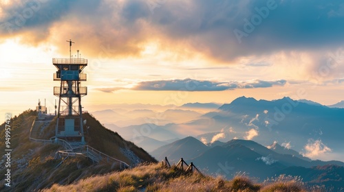 Fototapeta premium Mountain landscape with a lookout tower at sunset